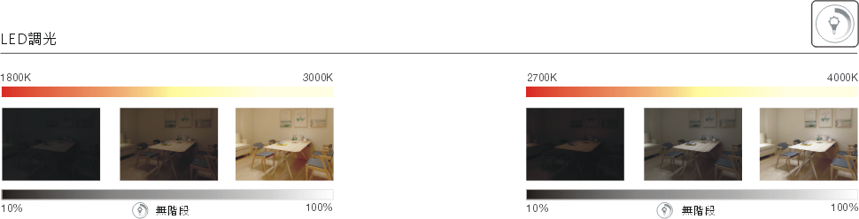 亮度調節: 燈光的亮度可以連續逐步變化,顯得很平滑,使你感覺到燈光是逐漸變化。在最亮與微亮之間遞增或遞減,直到你覺得適合你的要求為止。